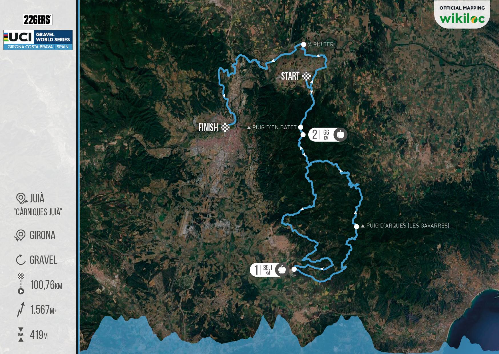 Le parcours 226ERS UCI Gravel World Series Sea Otter Europe Girona 2025 a une distance de 100 km avec 1567 m de dénivelé positif cumulé et traverse le cœur de l’un des massifs les plus connus de la région, le massif des Gavarres. En partant de la ville voisine de Gérone, à Juià (dans le parc de Càrniques Juià) et avec les premiers kilomètres neutralisés par l’asphalte jusqu’à commencer un sentier avec une pente considérable et longue jusqu’à atteindre le sommet, en traversant une route, pour entrer dans une zone montagneuse. Une chaîne de pistes larges, au terrain ferme et compacté, idéales pour pratiquer la discipline qui nous amènera à rechercher des terrains plus plats à travers les champs de culture et les zones rurales.